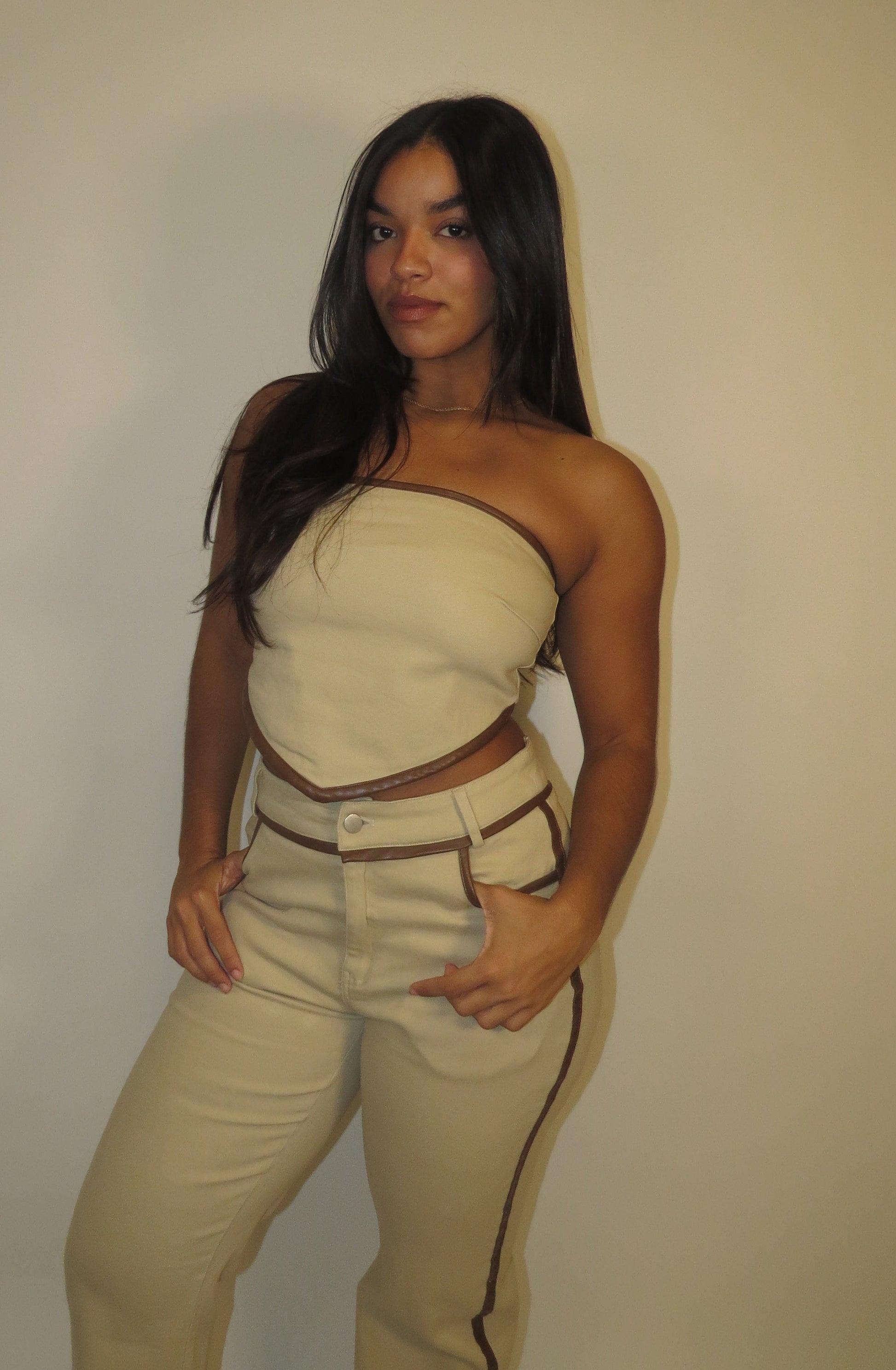 Cream jean set. Zipper on top. Brown detailing are leather.