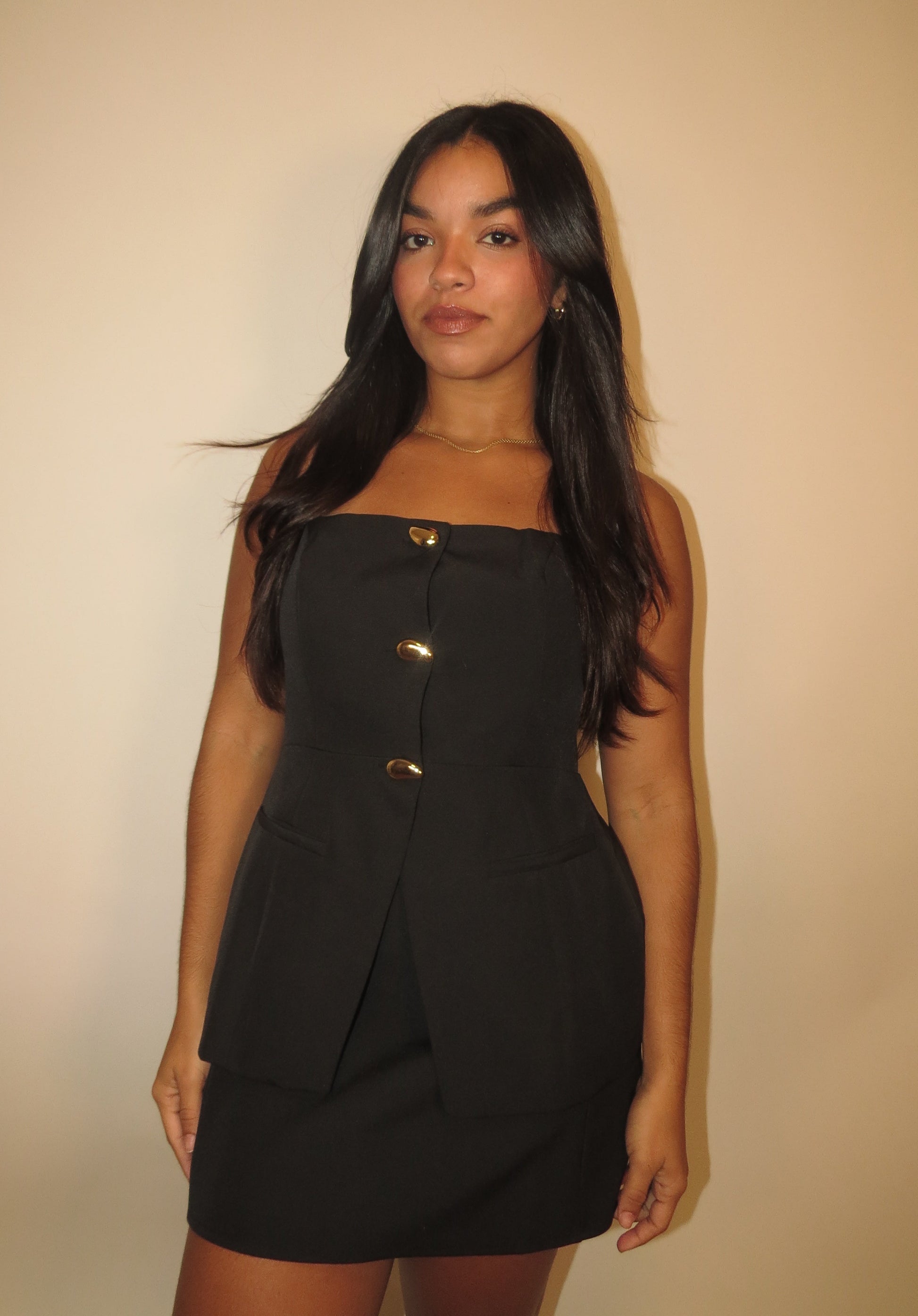 BLACK HALTER TOP, FULLY LINED, FRONT BUTTON CLOSURE, ADJUSTABLE HALTER NECK, FAUX POCKETS IN FRONT AND ADJUSTABLE BUCKLE AT BACK.