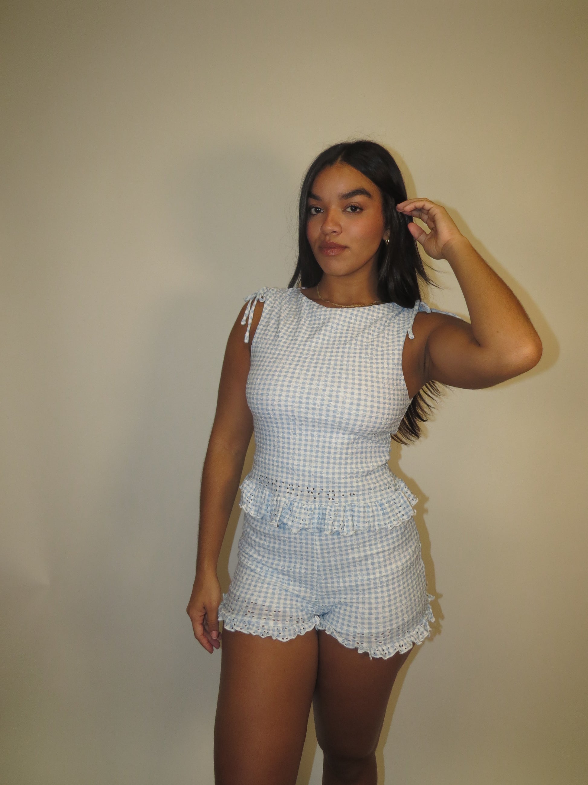 Gingham top and shorts set. Both pieces have lining and are stretch. Perfect for mix and match.